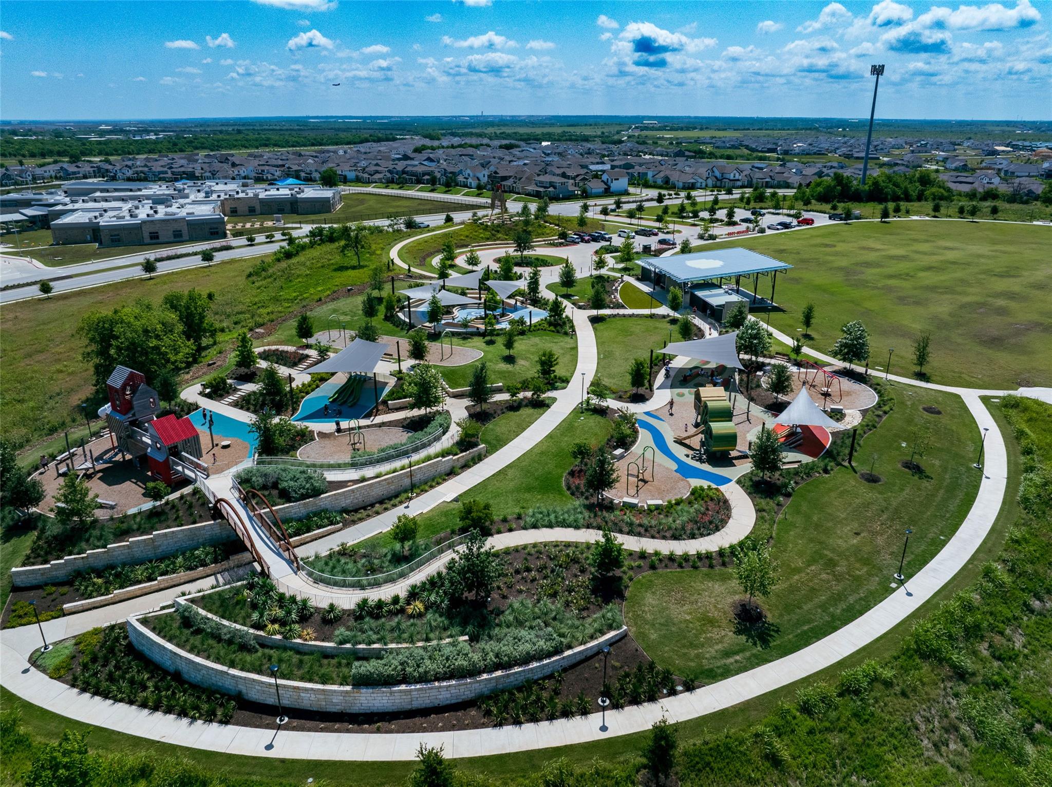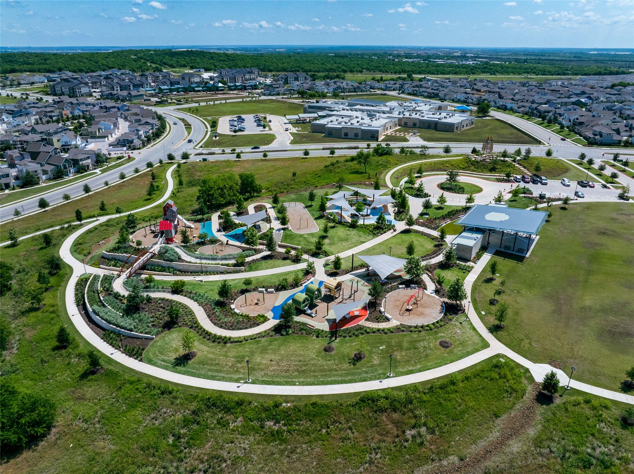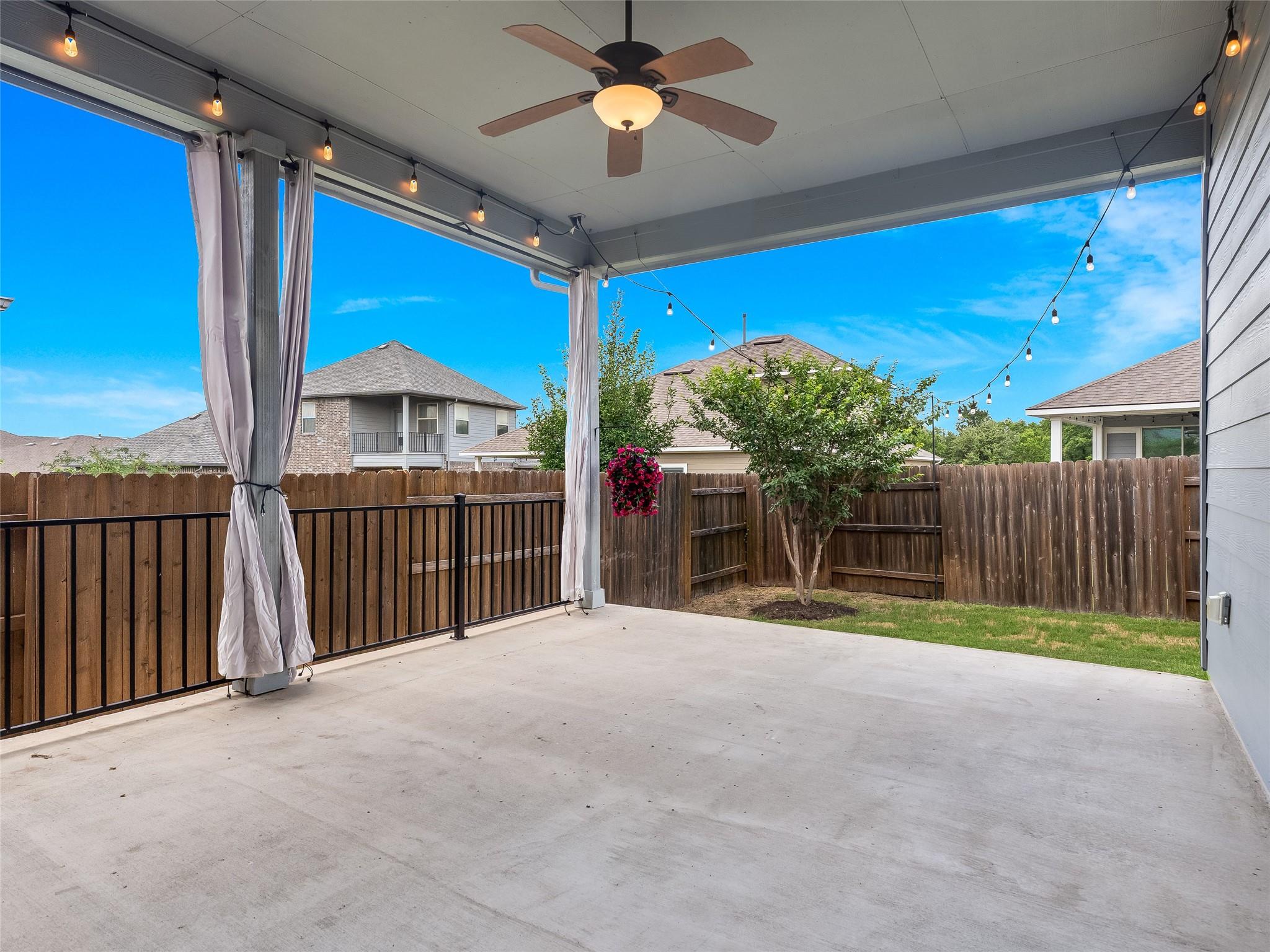 Located in the vibrant Easton Park community, this well-maintained single-story home offers a bright, open layout with soaring ceilings and beautiful wood-look tile flooring throughout. With only one neighbor and green space on the other side, enjoy both privacy and a peaceful setting. The spacious eat-in kitchen features an island with bar seating and flows seamlessly into the living areas, with a separate formal dining room that can easily serve as an office, home gym, playroom, or flex space. Large windows bring in abundant natural light, and neutral finishes create a warm, inviting atmosphere. Step outside to a large covered patio and custom hardscaped entertaining area--perfect for relaxing evenings or weekend get-togethers. Easton Park offers top-tier amenities including a resort-style pool, fitness center, miles of trails, and lively community events. Trolley Park is just around the corner for playdates and pup adventures, while the new 21-acre Skyline Park features zip lines, downtown views, and something for all ages. This home is move-in ready and offers the best of Southeast Austin living.